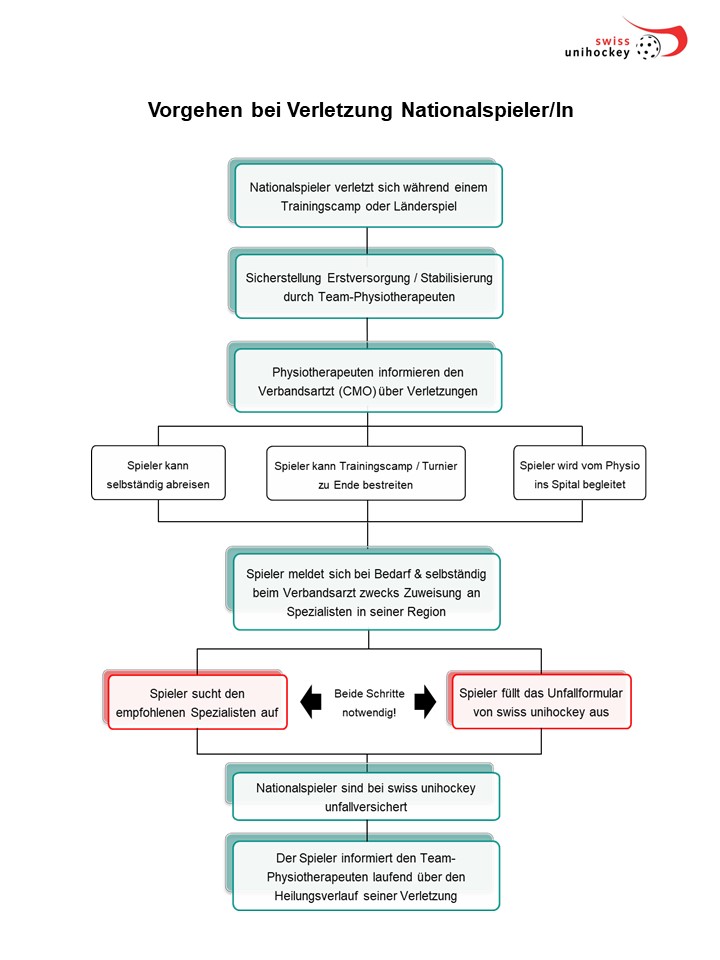 Das Dokument über das Vorgehen bei einer Verletzung einer Nationalspielerin resp. eines Nationalspielers sowie das Formular für die Unfallmeldung stehen zum Download zur Verfügung (siehe Box).