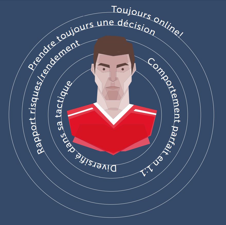 Le joueur a toujours une tâche sur le terrain. Il doit toujours être «online» pour que le jeu de son bloc fonctionne. Les quatre rôles de joueur aident à structurer le jeu. Le joueur connaît ce concept et sait qu’il a une tâche à accomplir en tout temps sur le terrain. Un joueur dirige la balle et les autres déterminent le jeu.